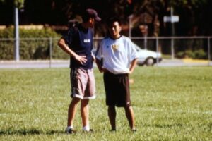 Goose (à gauche) et Fong en train de bavarder. Fong est le capitaine de Berkeley B, donc de l’équipe dans laquelle je joue : et est un des 4 handlers de l’équipe, avec Grill, DR et … moi !