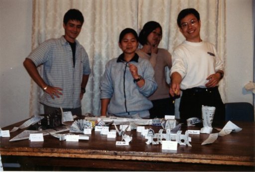 Séance origami : on est fiers de nous, et il y a de quoi. On a fait des guirelandes, des grenouilles, des bottes, des avions, des bateaux, des étoiles, et Johnny Mosley (cherchez bien, sur la droite).
