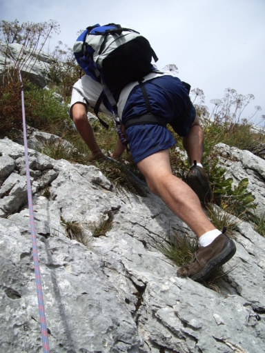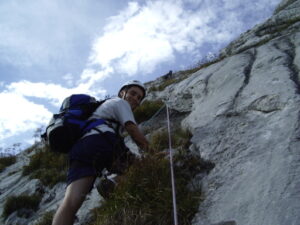 Après un peu de route sinueuse comme je les aime, et après une petite marche à flanc de montagne, nous voici arrivés au pied de la paroi que nous allons gravir. Ça s’appelle du terrain d’aventure et je ne suis plus très sûr de ce que ça veut dire. Mes deux experts de la grimpe m’ont accordé une quotation de 3 dans l’échelle ouverte (?) de difficulté (a priori 2 correspond à la difficulté d’une échelle).