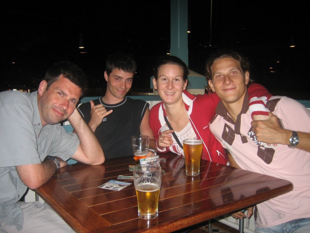 Salut les amis. Beaucoup de news sur Kangourou tour, et pas beaucoup ici. Je sais. Le temps passe tellement vite que je concentre mes efforts sur le site kangourou. Mais je vous avais prévenu, et puis je pense que vous y allez de toute façon. Aller bon, juste pour nous, voici une photo de Laure, JB, Sylvain et moi prise sur la plage de Manly, celle qui est à cinq minutes de leur appartement.