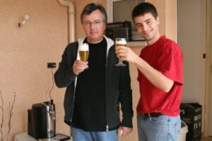 Voici la réponse de tout à l’heure : le cylindre était le fameux fût de 5 litres d’Heineken et le gros carton qui allait avec contenait la tireuse. Après pas moins de 15 heures de refroidissement (la chose s’assure que la bière est à 4 degrés et comme des naïfs, nous n’avions pas stocké le fût dans un frigo en attendant de l’offrir :o) papa-mou peut enfin s’y essayer et nous servir une bonne binouse comme on dit 🙂