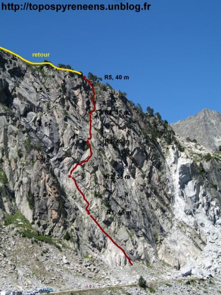 La voie est composée de cinq longueurs d’environ 40m chacune, ce qui fait une longueur totale de 200m.