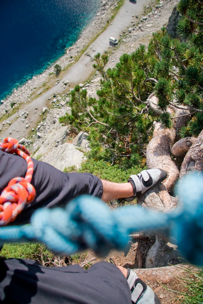 Ça démarre tranquillement avec du 4b. Tout ce qu’il faut pour prendre confiance. La difficulté augmente un petit peu dans la longueur suivante, mais c’est dans la troisième longueur que les choses se compliquent vraiment. Un dufler horizontal en 5c surplombe le vide. Heureusement, le guide nous montre comment nous y prendre avec les mains et surtout où sont les bonnes prises de pied. Finalement ça passe assez bien. La quatrième longueur remonte plusieurs petits murs fissurés. On est encore dans du 5c, mais la difficulté est différente cette fois : il faut faire de l’adhérence pour passer confortablement, le problème c’est que les chaussons commencent à faire mal. C’est décidé, je les enlève quelques minutes quand j’arrive au dernier relais. La dernière longueur n’est pas la plus technique, mais il y a un passage où je m’y prends mal. Du coup le guide me dit qu’il va me hisser pour me donner les quelques centimètres qu’il me manque pour passer. Mais je ne comprends pas ce qu’il me dit (il est 15m plus haut et on ne se voit pas). Peu importe, j’ai repéré une aspérité qui était derrière moi depuis le début et sur laquelle je peux poser mon pied pour me lever et atteindre le bac que je touchais à peine avant. Nickel 🙂