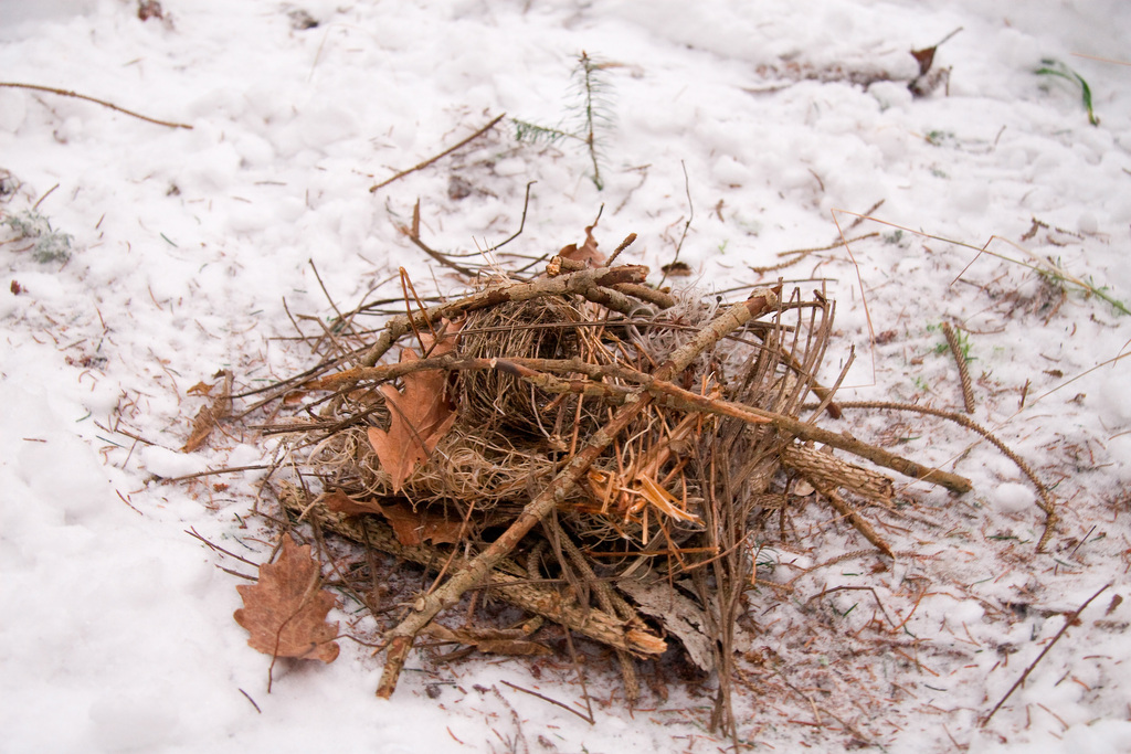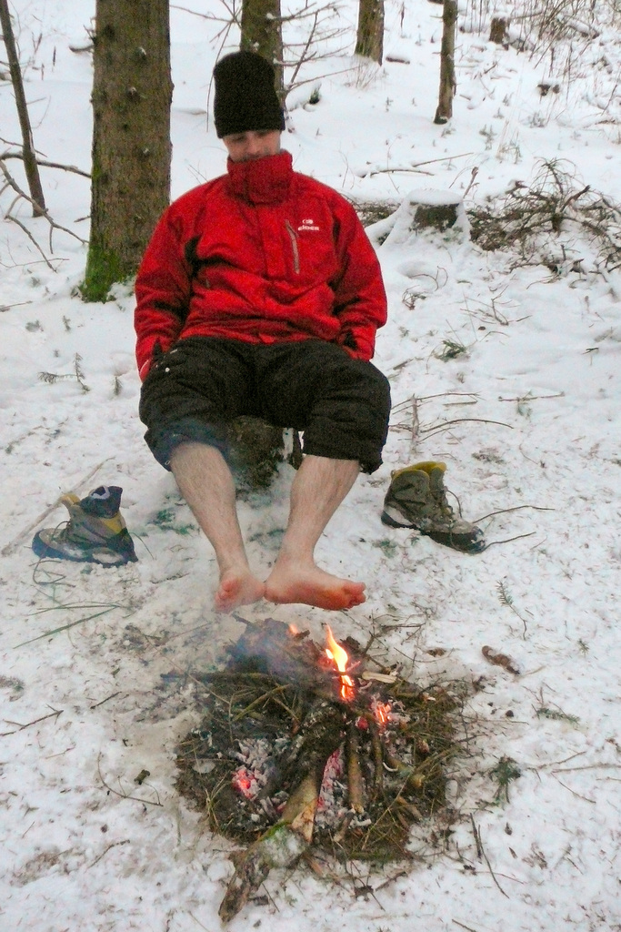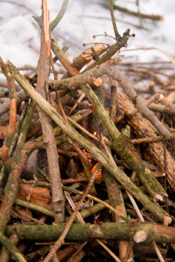 C’est là tout l’intérêt de passer par l’étape braises : après il n’y a qu’à ventiler pour enflammer les brindilles au sein desquelles la braise aura été préalablement enfermée. À leur tour, les brindilles enflammeront le petit bois, etc. D’après le guide, le top du top pour fabriquer de la braise est d’utiliser de l’amadou. Au cours de notre marche vosgienne, nous avons donc dépouillé le premier arbre venu d’un amadou de bonne taille et nous en avons extrait le cœur (qui était un peu pourri). En guise de brindilles, nous avons pris du chardon fané et des brindilles de sapin que nous avons mis en boule. Il n’y avait plus qu’à sortir la pierre à feu et à envoyer quelques étincelles sur l’amadou. Et là miracle ! Une seule étincelle a atterri sur l’amadou, mais après cinq minutes d’attente, c’est un bon centimètre carré d’amadou qui s’était embrasé (on n’osait pas souffler pour que ça aille plus vite, mais de toute évidence on aurait pu). Bref, la suite du plan était d’enfermer l’amadou dans la boule de brindilles et de souffler jusqu’à ce que le tout sèche, chauffe, et enfin s’enflamme. Pour ça il faut avoir la foi et faire gaffe à l’hyperventilation ! Toujours est-il que les flammes arrivèrent assez vites, mais s’éteignaient toutes aussi rapidement. C’est à ce moment que l’espoir retombe car on pense devoir tout recommencer, mais en réalité l’amadou est toujours là, bien rouge, et il suffit de continuer à souffler jusqu’à ce que les flammes produites tiennent bon. C’est ce que nous avons fait, pendant trois bons quart d’heure même. Mais le résultat était là : un joli feu pour nous réchauffer.