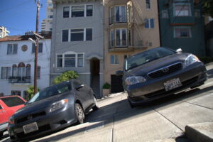 J’ai donc joué à ce petit jeu dans les pentes les plus raides que j’ai trouvées et je n’ai effectivement rien mesuré qui soit ne serait-ce qu’égal à 30°. Il faut donc se rendre à l’évidence, les pistes de ski ont au mieux une petite pente de 30°. Déception pour l’égo. Si vous aussi vous êtes déçus, convertissez en pente routière et ça donne le chiffre plus valorisant de 50%. Ceux qui ont déjà descendu en voiture la rue Filbert de San Francisco (31.5%, soit environ 17°, voire photo ci-contre) imaginent assez bien, je pense, ce que donnerait une route pentue à 50%.